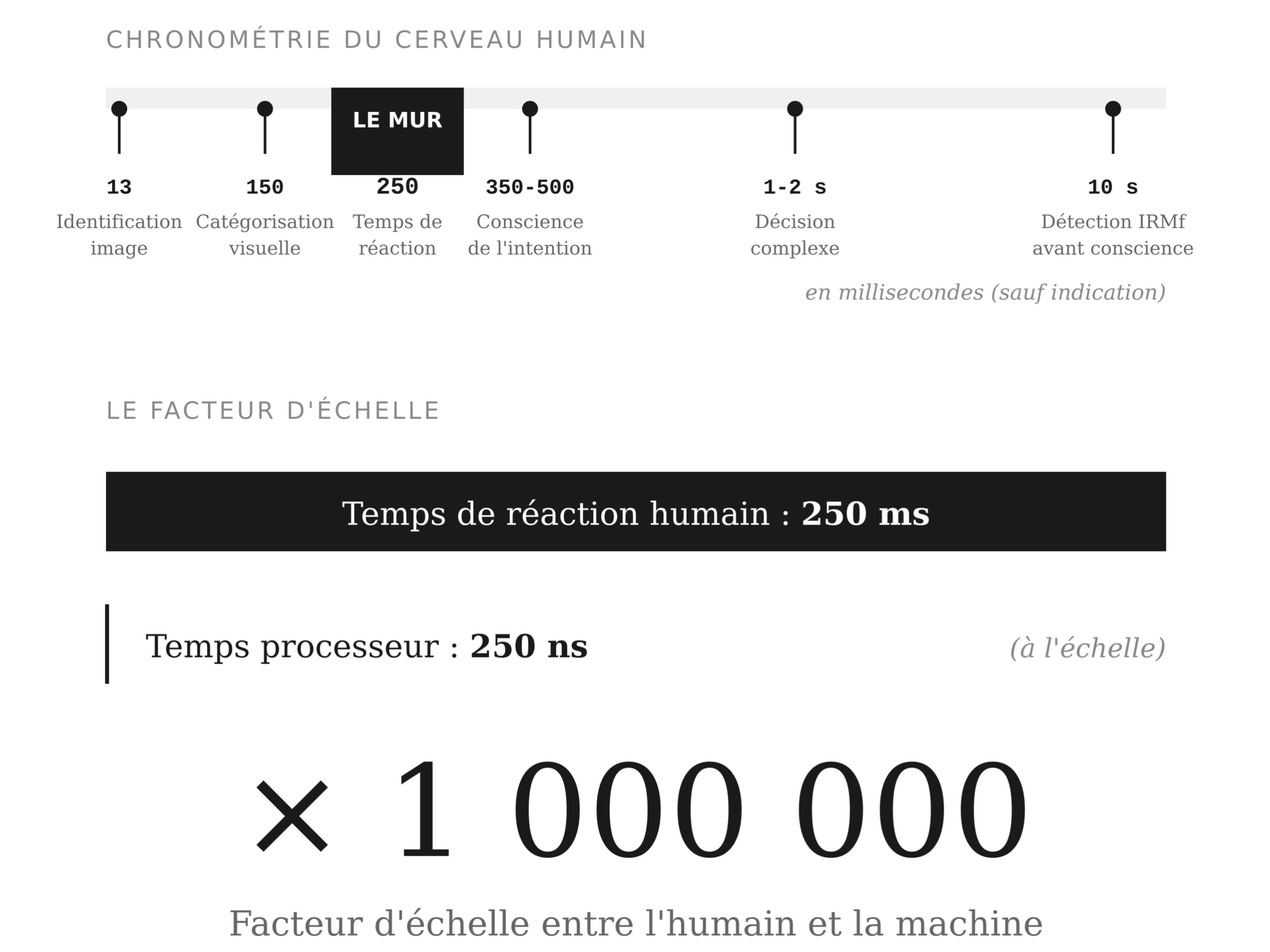 Le temps de réaction moyen humain se stabilise autour de 250 ms, c'est notre plancher. On ne descendra pas en dessous. C'est le Mur des 250 millisecondes : non pas un obstacle technologique à surmonter, mais une frontière biologique définitive.